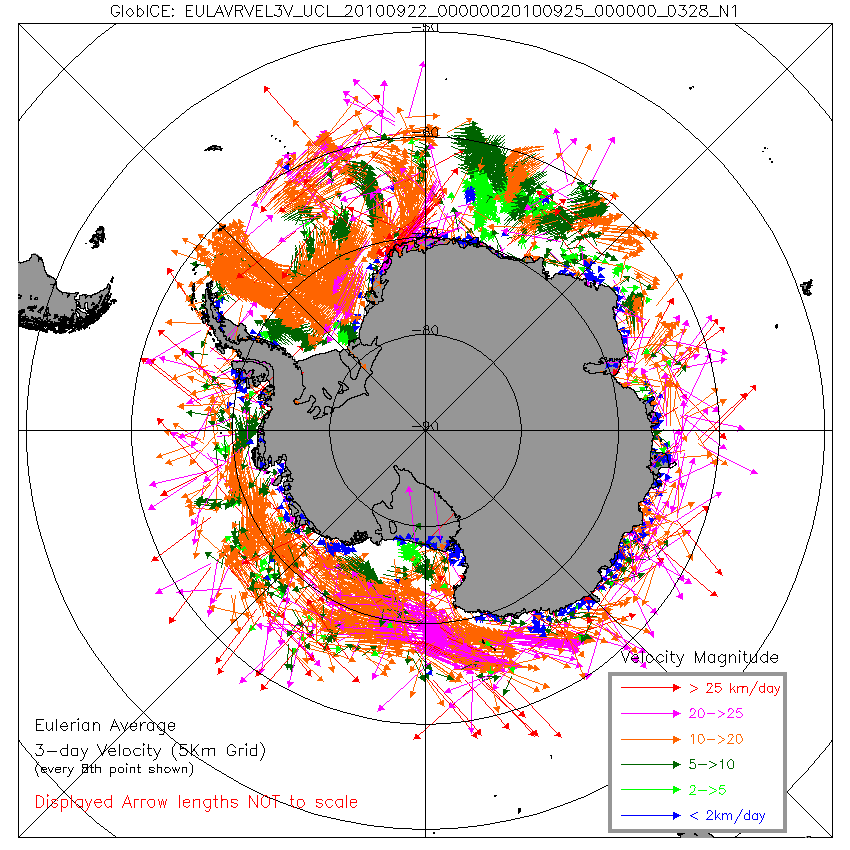 3-day average ice velocity for 22 September 2010, generated by the GlobICE Antarctic prototype ice information system. Data are computed on a 5 km grid, with every 8th point shown on this plot (40 km grid). (Credit: UCL/ESA)