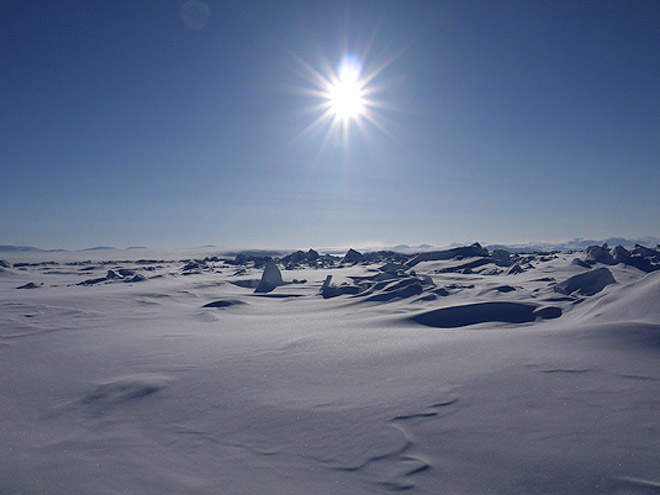 Sun, ice and sky at the edge of the Arctic Ocean. Sea ice plays a key role in the energy exchanges between ocean and atmosphere. (Credit: K Giles)